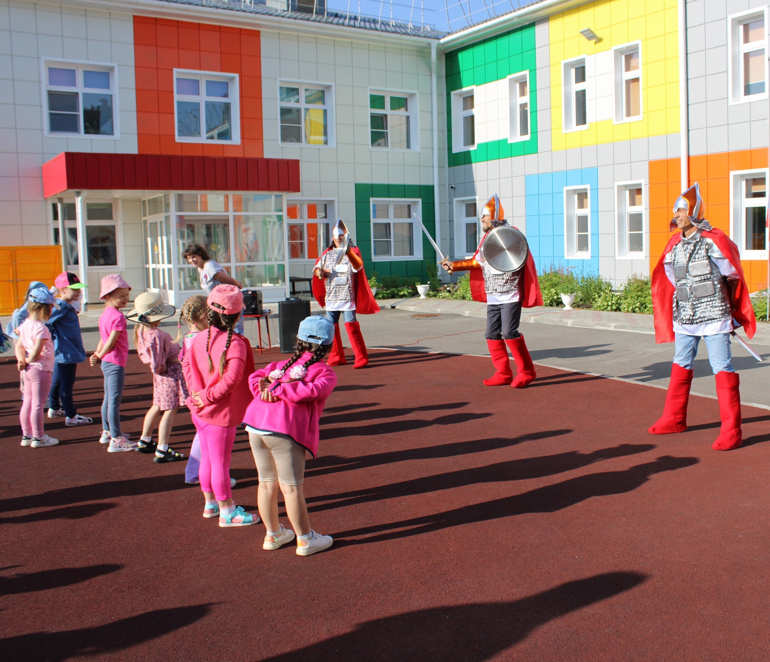 Сегодня праздничное утро началось по-особенному — с настоящей богатырской зарядки! К нам в гости пришли самые сильные и смелые русские богатыри — Илюша, Добрыня, Алёша!